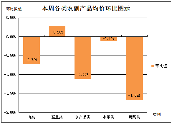 五、蔬菜類產品平均價格總體小幅回落。本周,隨著北方冷空氣的南下,高溫天氣有所下降,有利于蔬菜的生長,蔬菜市場價格小幅回落。受監測的19種蔬菜類產品平均價格呈5升13降1平,小幅回落態勢。其中圓白菜(包菜)平均價格上漲幅度最為明顯,漲幅達22.99%,為價格波動之首;茄子平均價格平穩;土豆、大白菜、韭菜、黃瓜等4種蔬菜平均價格分別上漲0.21%、0.58%、0.64%、1.87%;其余13種蔬菜類產品平均價格回落幅度均在6.50%以內波動。本周主要農副產品具體均價漲跌情況,詳見圖二。